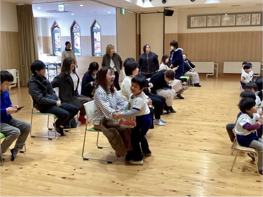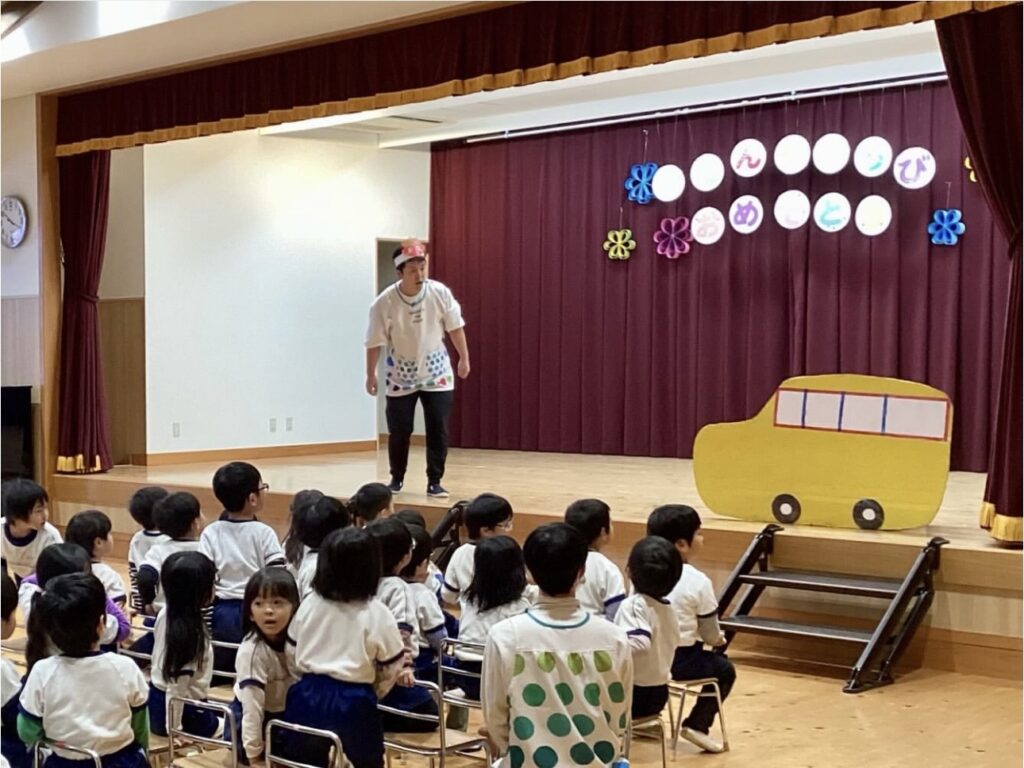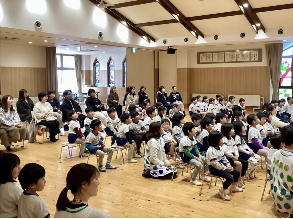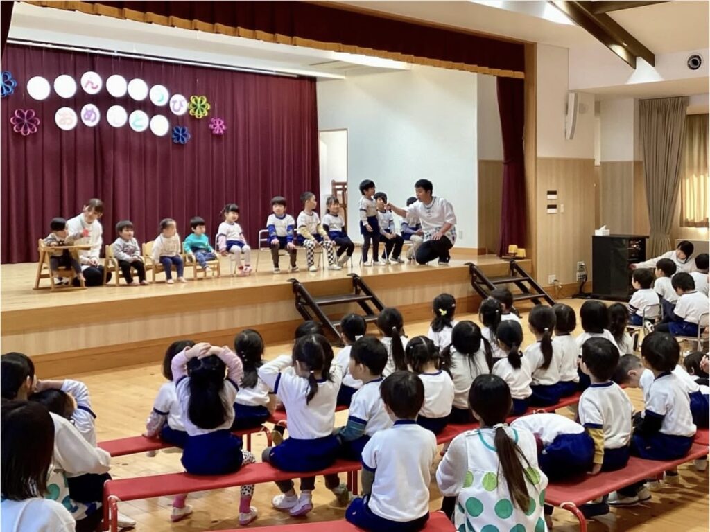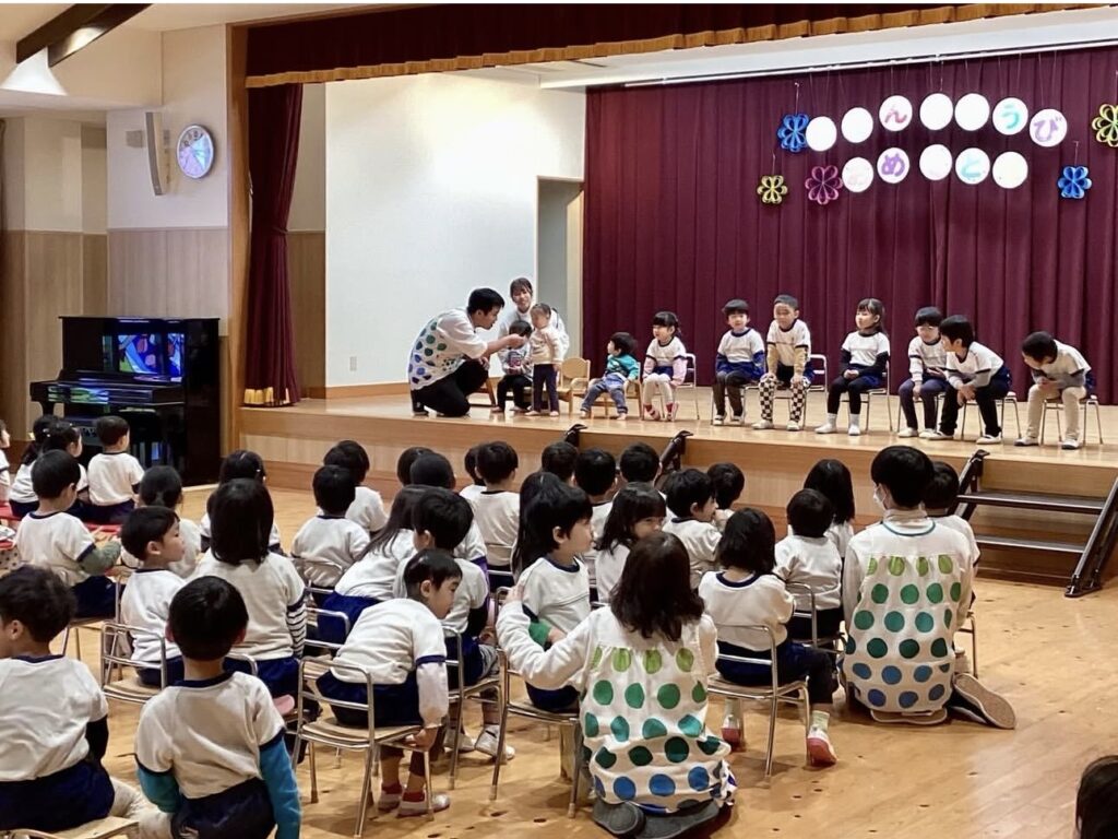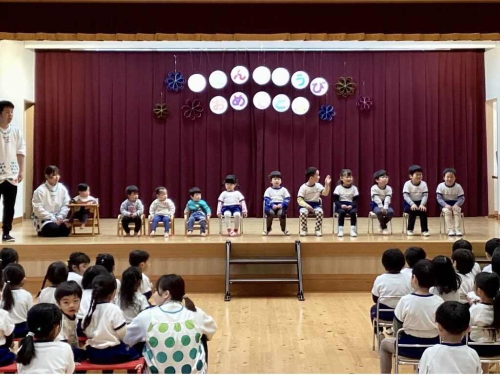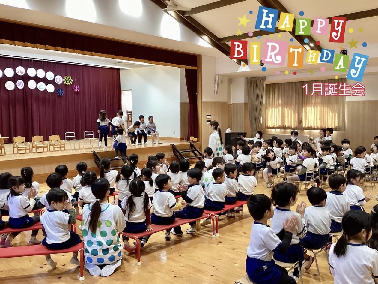 お誕生日おめでとう!~1月誕生会~ 2026.02.02誕生会 1月の誕生会がありました🎁 緊張しながらも、インタビューにしっかりと答えていた1月生まれのお友だち😊 お手伝いのなのはな組さんからプレゼントを首にかけてもらったみんな。嬉しそうにカードを見ていました💛 鬼のお面を付けた保育者が登場! 節分を控えたこの日のプレゼントは・・・ 大型絵本「まめまきバス」🚌 ストーリーに引き込まれて絵本を楽しんでいたみんな☺ 最後に「心の中の“泣き虫鬼”や“好き嫌い鬼”をやっつけよう!」と誓いました👹 新年最初の誕生会の司会。とってもかっこよかったよ✨ 2026年も元気に楽しく過ごしていこうね!!1月生まれのお友だち、お誕生日おめでとう🎉🎉🎉 誕生会